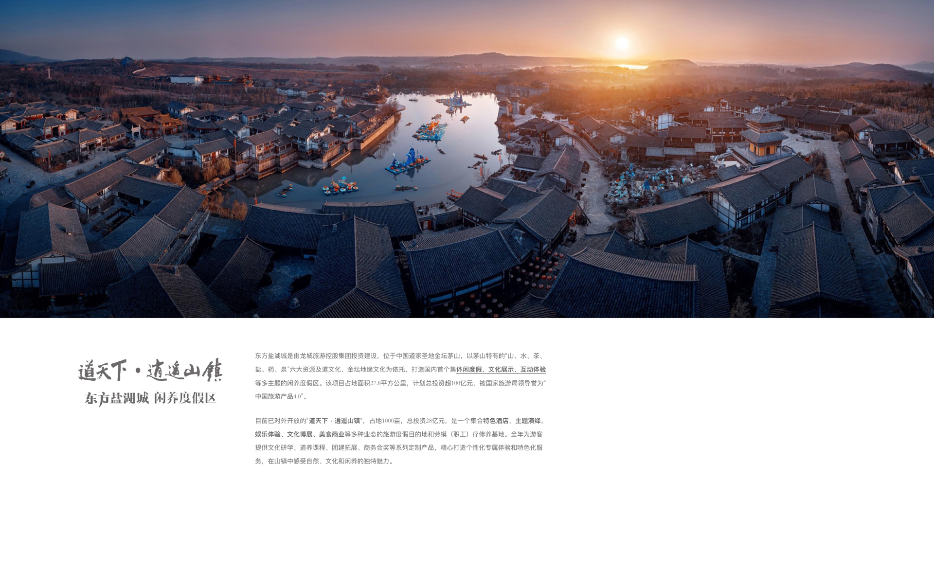 東方鹽湖城是由龍城旅游控股集團(tuán)投資建設(shè),位于中國道家圣地金壇茅山,以茅山特有的“山、水、茶、 鹽、藥、泉”六大資源及道文化為依托,打造國內(nèi)首個(gè)集休閑度假、文化展示、互動(dòng)體驗(yàn) 等多主題的閑養(yǎng)度假區(qū)。對(duì)外開放的“道天下·逍遙山鎮(zhèn)“,占地1000畝,是一個(gè)集合特色酒店、主題演繹、 娛樂體驗(yàn)、文化博展、美食商業(yè)等多種業(yè)態(tài)的旅游度假目的地和勞模(職工)療修養(yǎng)基地。為爭創(chuàng)5A級(jí)景區(qū)并解決景區(qū)原有導(dǎo)視系統(tǒng)功能不足等問題,東方鹽湖城旅游發(fā)展公司啟動(dòng)了道天下景區(qū)導(dǎo)視系統(tǒng)設(shè)計(jì)的工作。